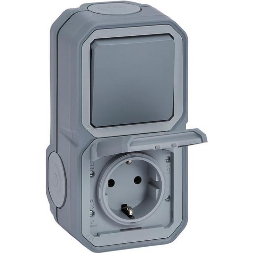 Legrand Aufputz Schuko-Steckdose+Wechselschalter horiz. u. vertikal. Steckklemmen Plexo New