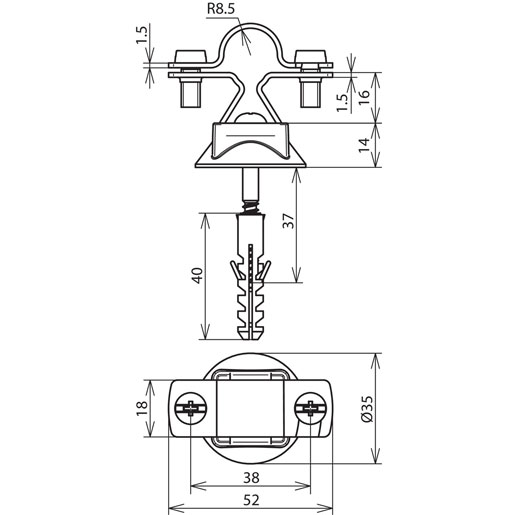Werkstoff LH: NIRO LH Rd: 16 mm Bauhöhe LH: 20 mm Kunststoffdübel: Ø8x40 mm