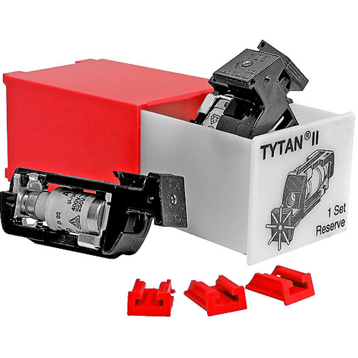 Sicherungs-Set mit Blinkeinsatz, Baugröße D01, Bemessungsstrom 10A, Farbcode rot, Betriebsklasse gG (gL), Bemessungsbetriebsspannung 60-400V AC / 60-220V DC, Prüfspannung 5kV, DIN-Schienenmontage, 1 Set besteht aus: 3 Sicherungs-Einsätzen, 3 Stromkodierungen, 1 Kunststoffbox in der Farbe der Kennmelder | |||